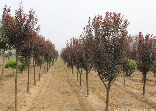 紫葉李為櫻李的觀賞變型種類,是華東及華北地區最受歡迎的彩色觀葉樹種,也是人們所關注的,它既可以直接的生長供其觀賞,也可以對整棵樹形進行修剪,都有不同的觀賞價值,它的嫩葉鮮紅,老葉紫紅,是常年觀葉的品種,它與其它樹種搭配,紅綠相應,互相起到映襯的效果,搭配協調。
